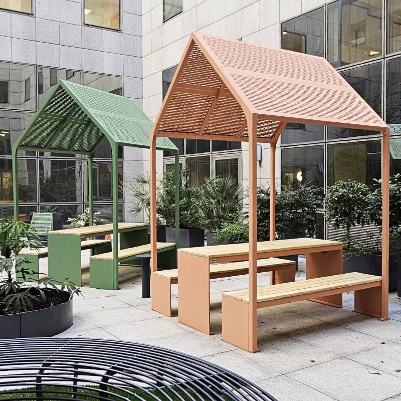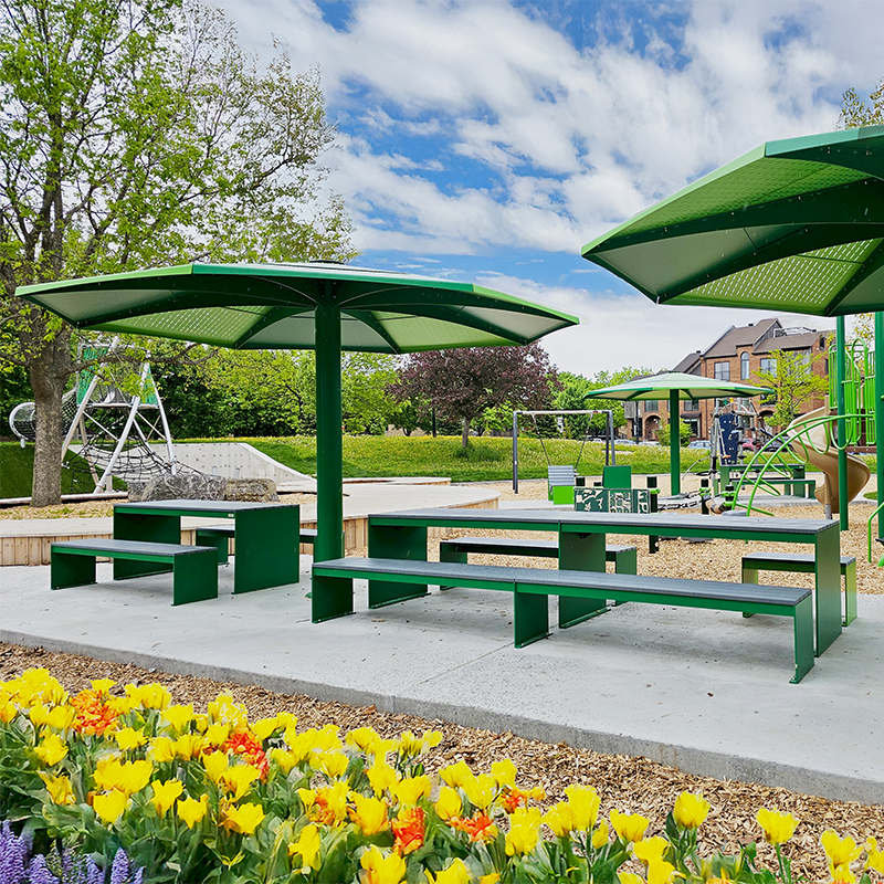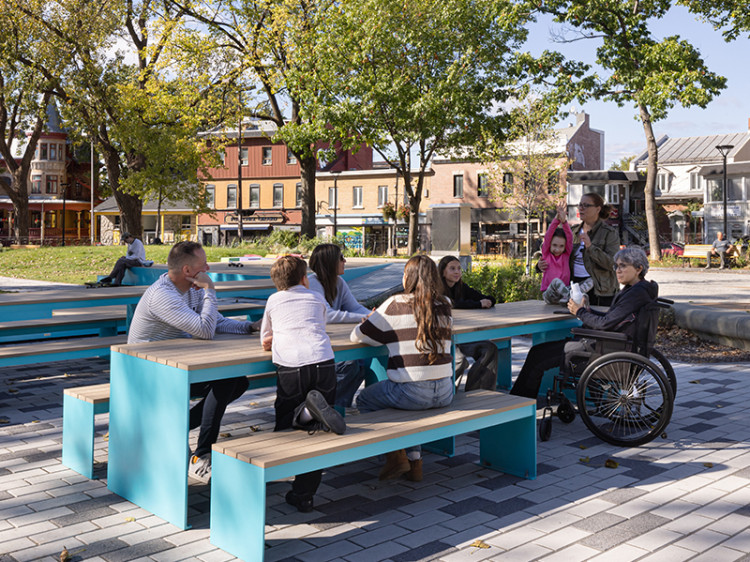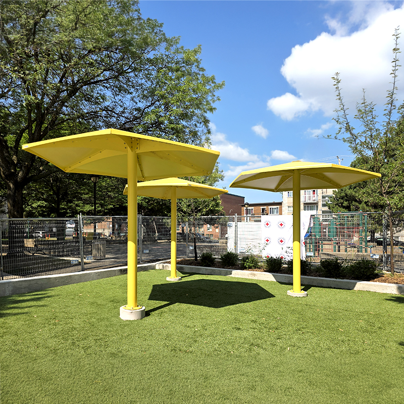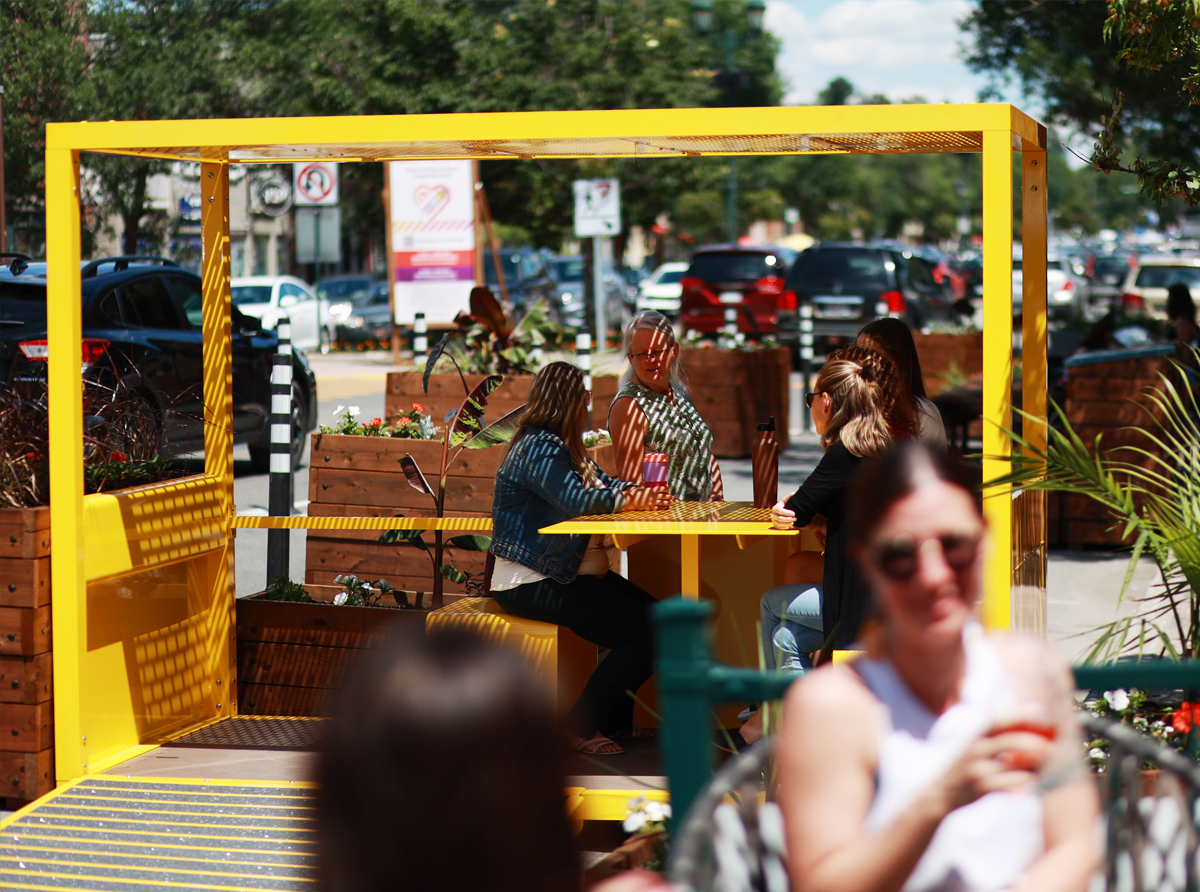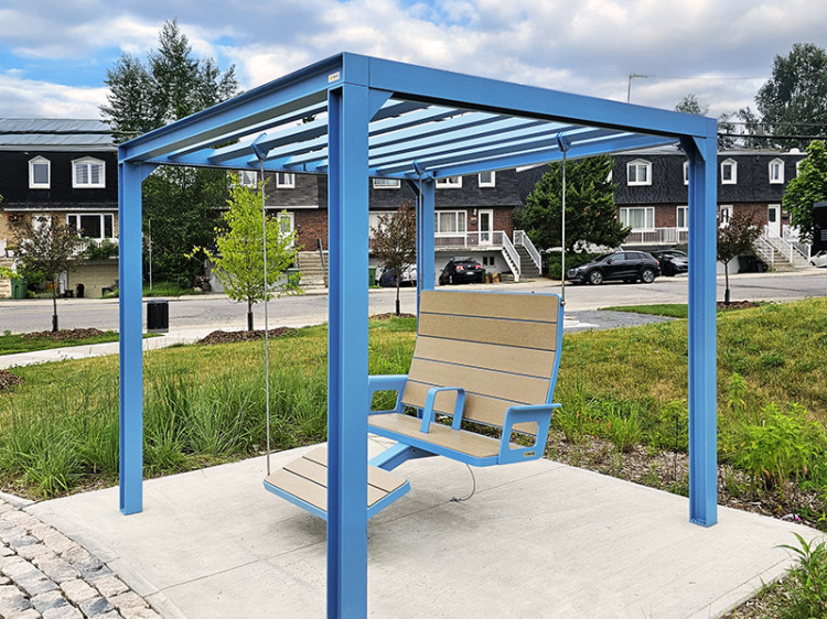 Balancelle urbaine – Table pique-nique – Table pique ADA – Table pique avec abri solaire – Maisonnette urbaine – Hamac urbain – Chaise longue urbaine – Mobiliers espace collaboratif – Stationnement à vélos – Banc urbain – Mobiliers transitoires – Rue piétonne – Place éphémère – Espace commercial – Toit-terrasse