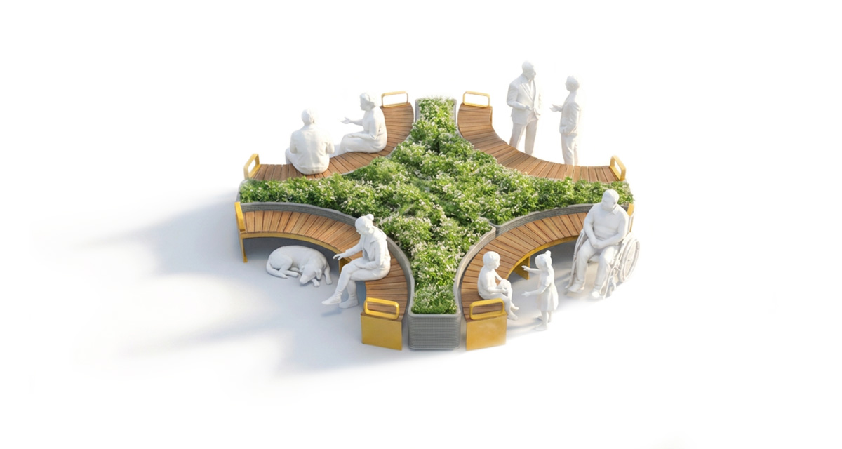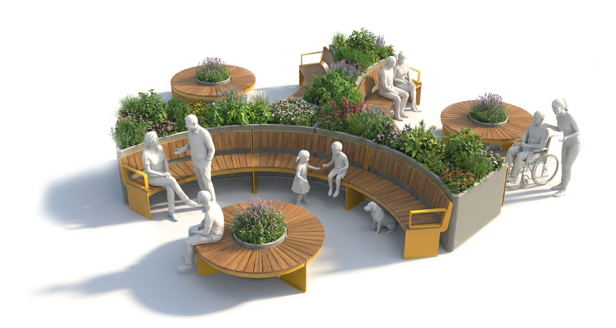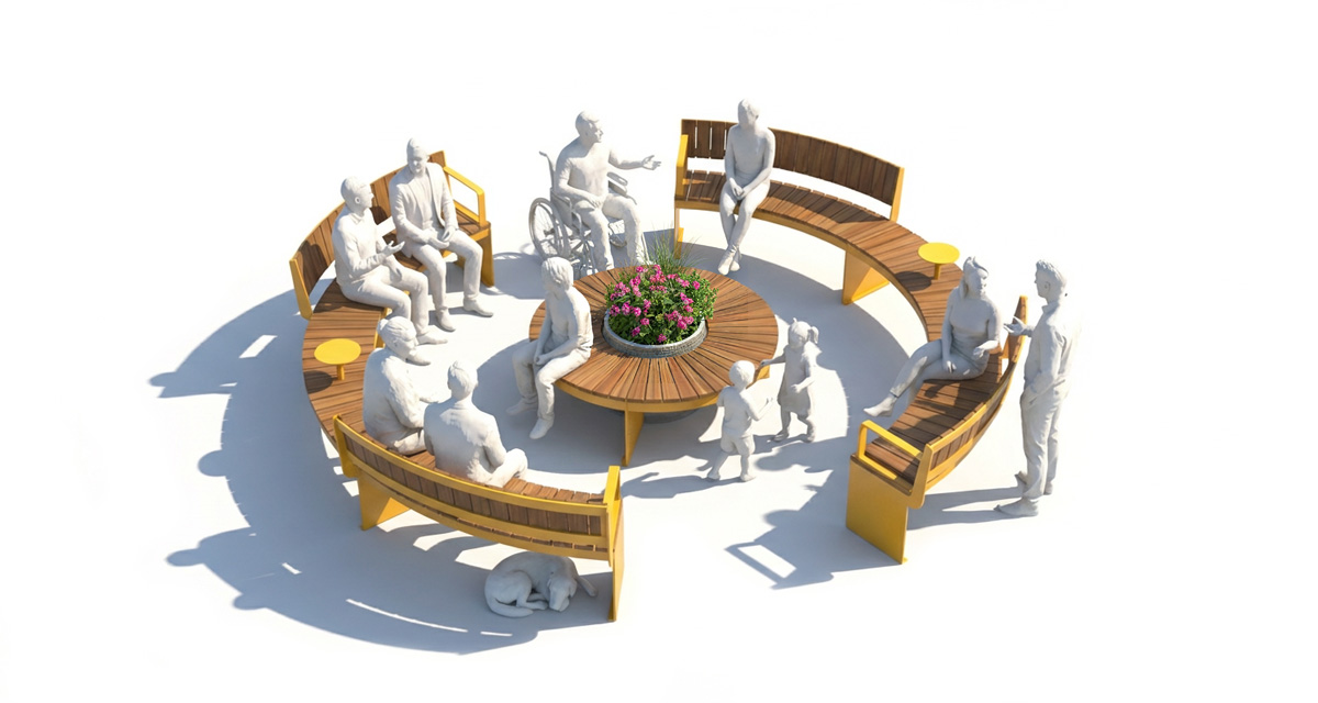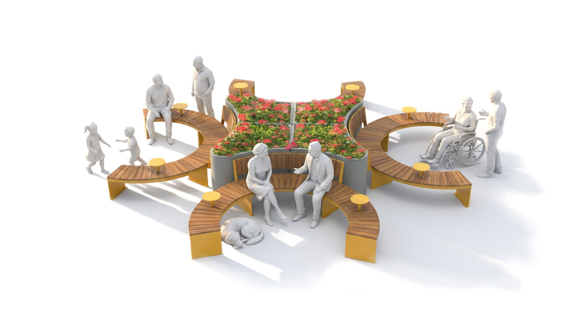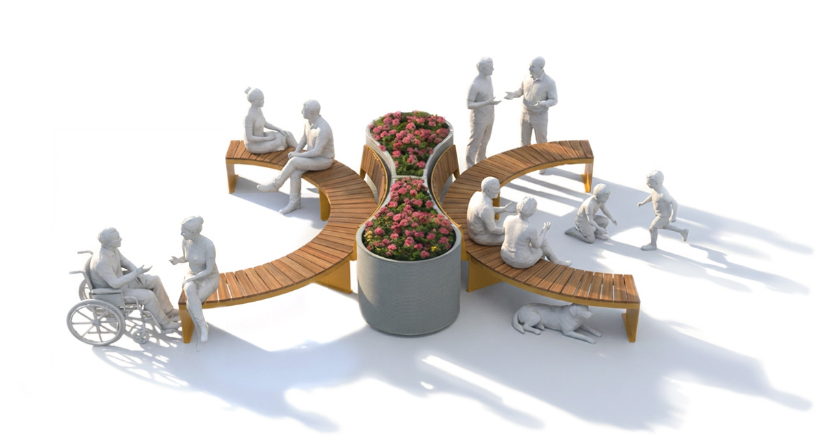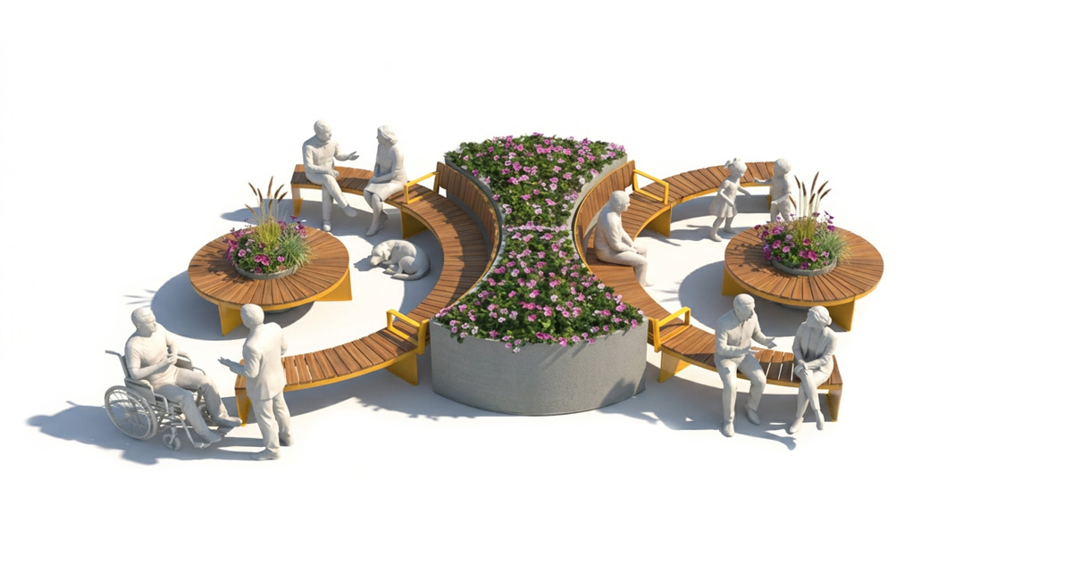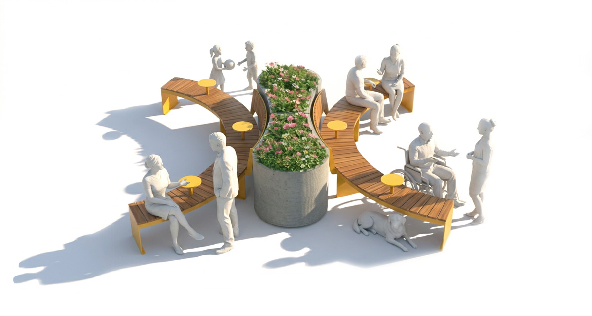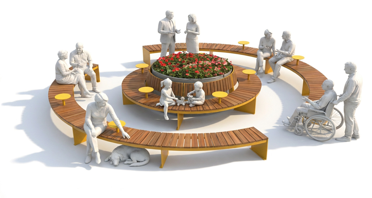 La signature intemporelle du mobilier urbain banc en arc de cercle repose sur la Collection INFINITO.
