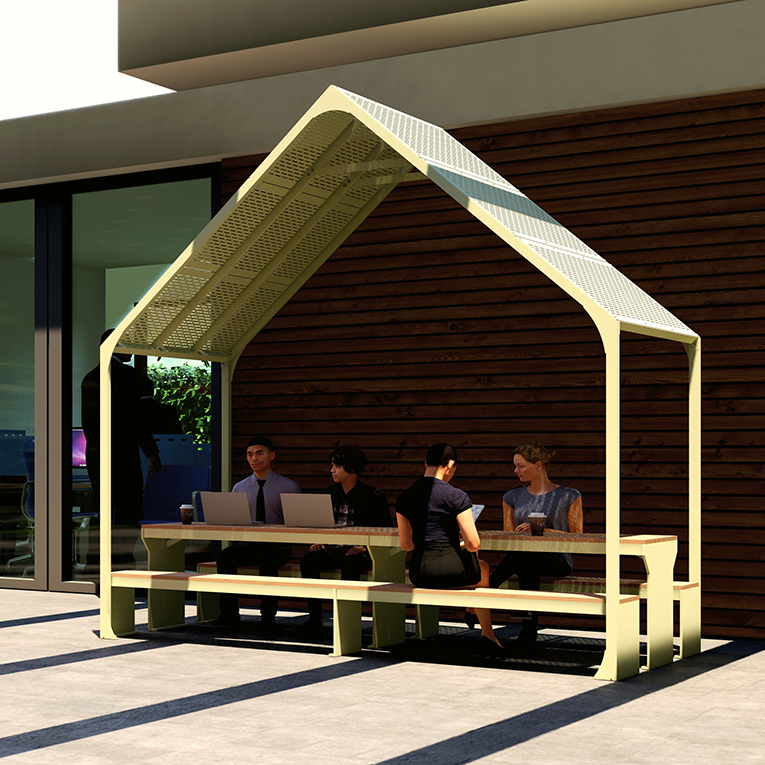 Configurez l’abri solaire avec deux tables, avec un espace pour l’accessibilité universelle pouvant accueillir une personne avec une mobilité réduite ou encore une table et un banc; à vous de sélectionner votre modèle de Maisonnette TEAM selon les besoins de votre projet.